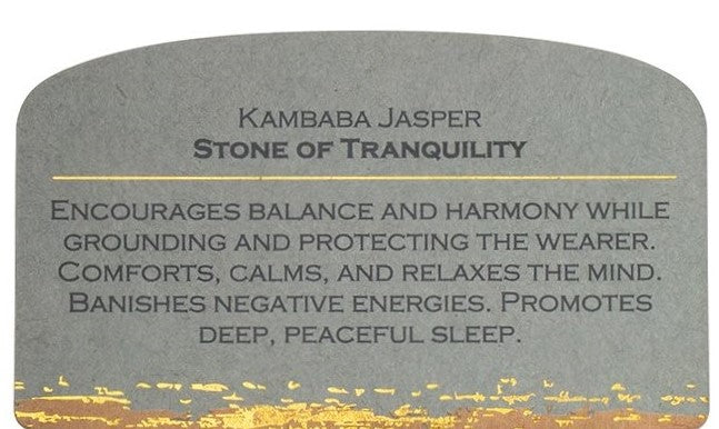 Kambaba Jasper | Stone of Tranquility. Encourages balance and harmony while grounding and protecting the wearer. Comforts, calms, and relaxes the mind. Banishes negative energies. Promotes deep, peaceful sleep.